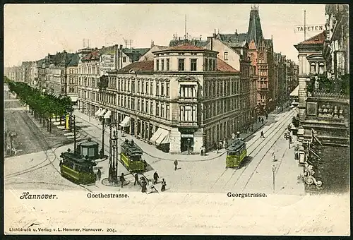 - ↑ Adreßbuch, Stadt- und Geschäfts-Handbuch der Königlichen Haupt- und Residenzstadt Hannover und der Stadt Linden, sowie der Ortschaften Döhren-Waldhausen, Limmer und Ricklingen 1901, Abteilung II: Straßen- und Häuserverzeichniß, S. 237; Digitalisat der Gottfried Wilhelm Leibniz Bibliothek – Niedersächsische Landesbibliothek über die Deutsche Forschungsgemeinschaft