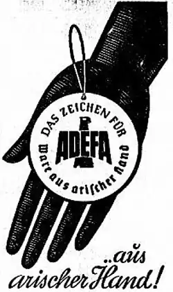Die zum Zweck der systematischen „Arisierung“ dieses Wirtschaftszweiges 1933 gegründete, auf Selbstverpflichtung beruhende Adefa verbot ihren etwa 500 Mitgliedern (Stand 1938) jeglichen Geschäftsverkehr mit jüdischen Produktions- und Handelsbetrieben. Adefa-Mitglieder warben bereits ab dem Judenboykott im April 1933 mit einem in die Ware eingenähten Logo und „Gütesiegel“ – „aus arischer Hand“ – und versuchten so, das antijüdische Gesellschaftsklima für eigene ökonomische Interessen auszunutzen.[6]
