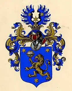 Blasonierung: In Blau ein goldener rothbezungter Löwe, in der rechten Vorderpranke einen silbernen goldengefaßten Himmelsglobus tragend und von drei goldenen Sternen, zweien oben und einem unten, begleitet. Auf dem Schilde ruht ein gekrönter Turnierhelm. Die Krone des Helms trägt einen offenen blauen Adlerflug, welcher jederseits mit einem goldenen Sterne belegt ist und einen dritten einschließt. Die Helmdecken sind zu beiden Seiten blau mit Gold unterlegt.[18]