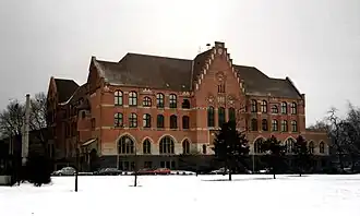 Die Bruckhauser Hütte wurde weiter ausgebaut: 1956 kam ein Kaltbandwerk hinzu, 1957 wurden weitere Thomaskonverter und das Siemens-Martin-Werk I in Betrieb genommen, die Blockbrammenstraße II fertiggestellt und ein weiterer Hochofen angeblasen. 1958 wurde schließlich zur Veredelung eine Sendzimir-Bandverzinkungsanlage in Betrieb genommen. Ebenfalls 1958 wurde das neue Tor 1 fertiggestellt.[16] 1959 wurde schließlich der erste Großhochofen (Hochofen 10, später 8) angeblasen, mit einer Tagesleistung von knapp 2.000 t Roheisen.[17] 1958 wurde mit dem Bau des neuen Hauptverwaltungsgebäudes durch Gerhard Weber an der Kaiser-Wilhelm-Straße begonnen, schräg gegenüber Tor 1. Dadurch sollte symbolisch das Näherrücken von Verwaltung und Produktion symbolisiert werden. Es war jedoch auch notwendig geworden, da durch das enorme Wachstum in den Wirtschaftswunderjahren mehr Bürofläche benötigt wurde. In denselben Jahren wurde auch die Kokerei, im Krieg ziemlich mitgenommen und ab 1947 wieder in Betrieb, erweitert; es wurden drei weitere Batterien gebaut, sodass man schließlich bei einer Belegschaft von 650 Mitarbeitern knapp 4.600 t Koks pro Tag erzeugen konnte.[18]