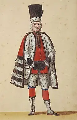 Mütze, Cape, Jacke, Hose und Stiefel sind aus Hermelin, auf allen Teilen aufgesetzte Hermelinschweife mit ihren schwarzen Schwanzspitzen. Der Muff ist aus Zobel gearbeitet, mit dem auch das Cape die Jacke und die Stiefel verziert sind.[2] Auf dem Kopf hat der Kurfürst eine hohe Mütze. Der aufgeschlagene, dem sächsischen Kurhut ähnliche Rand ist aus Hermelin, der hohe, zylinderartige Hutstumpen aus Zobel, linksseitig wohl mit einer gamsbartähnlichen Ausschmückung. Über einer dunkel umrandeten Weste oder Jacke befindet sich eine längere, kragenlose Hermelinjacke, rundum und an den Taschenpatten mit Zobel verbrämt, mit oben spitzgeformten Ärmelstulpen. Die Jacke ist schmal geschnitten, die Vorderkanten klaffen weit auseinander. Eine eng anliegende Hermelinhose endet oberhalb der Knie, an den Beinabschlüssen verbrämt. Über allem trägt er einen bis etwa zum Ende der Hosenbeine reichenden Umhang, der knapp die Schultern bedeckt und Ärmel und Vorderteile völlig frei lässt. Das obere Teil scheint aus Stoff zu sein, gefolgt von je vier Querstreifen, abwechselnd das Fell der Verbrämung und Hermelin. Das ganze Cape ist ebenfalls mit Zobel verbrämt, offenbar gehalten von einem langen, vorn am Hals gebundenen Band, wohl auch aus der zweiten Pelzart. Sogar die Stiefel sind aus mit Schweifen besetztem Hermelin. Die Verbrämung der oberen Kante geht in einen schmalen Mittelstreifen über, der bis zu den Schuhspitzen reicht. Um die Knie herum sind die Beine unbedeckt, vielleicht mit Seidenstrümpfen bekleidet. Den Mittelpunkt des Aquarells bildet der kleine Muff, in den der Fürst die Hände gesteckt hat.