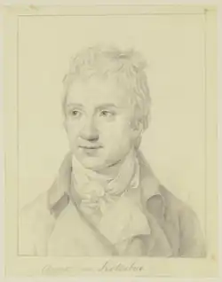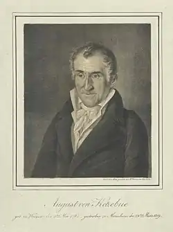 August Friedrich Ferdinand von Kotzebue [] (* 3. Mai 1761 in Weimar;[1] † 23. März 1819 in Mannheim) war ein deutscher Dramatiker, Librettist, Schriftsteller und Publizist. Als solcher war er äußerst erfolgreich und produktiv, er schrieb über 240 Stücke, die auf allen Bühnen Europas gespielt wurden. Neben August Wilhelm Iffland war er der meistgespielte Autor seiner Zeit, allein Johann Wolfgang von Goethe inszenierte 80 seiner Dramen. Er wirkte unter anderem in St. Petersburg, Wien, Königsberg und Reval, im Baltikum kam er zu Besitz und begründete die deutsch-baltischen Linien der Familie. Auch politische Ämter hatte er inne, zuletzt war er russischer Staatsrat und Generalkonsul. Als spätaufklärerischer Denker war er für eine aufgeklärte Restauration und kritisierte die deutsche Nationalbewegung polemisch. So wurde er zum Hassobjekt der nationalliberal gesinnten Studenten. Kotzebues Ermordung durch den Burschenschafter Karl Ludwig Sand war der Auslöser der Karlsbader Beschlüsse.