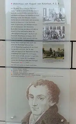 Der Jenaer Burschenschafter und Theologiestudent Karl Ludwig Sand folgte August von Kotzebue nach Mannheim.[39] Er erstach den Schriftsteller am 23. März 1819 vor den Augen seines vierjährigen Sohnes Alexander mit den Worten: „Hier, du Verräter des Vaterlandes!“ Ermordet wurde Kotzebue in seinem Wohnhaus in A 2, 5, das nicht mehr existiert und an dessen Stelle heute eine Gedenktafel angebracht ist.[40] Kotzebues zum Zeitpunkt des Mordes etwa 20-jähriger Sohn August wurde nach der Ermordung seines Vaters zum Austritt aus der Urburschenschaft gezwungen, in der Sand auch Mitglied war.[41]