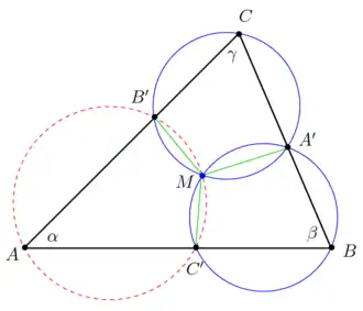 - Satz von Miquel, auch Dreiecksatz von Miquel: Über die Schnittpunkte einer Kette von drei Kreisen (Miquel-Kreise), die jeweils durch eine der Ecken eines Dreiecks gehen und bei denen die Schnittpunkte benachbarter Kreise auf den Dreiecksseiten liegen: im zweiten Schnittpunkt (Miquel-Punkt) schneiden sich alle drei Kreise.[8]