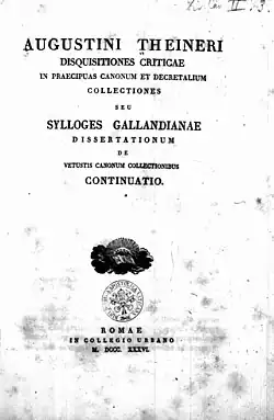 - ↑ Theiner, Augustin. In: Jesús Martínez de Bujanda, Marcella Richter: Index des livres interdits: Index librorum prohibitorum 1600–1966. Médiaspaul, Montréal 2002, ISBN 2-89420-522-8, S. 874–875 (französisch, Digitalisat).