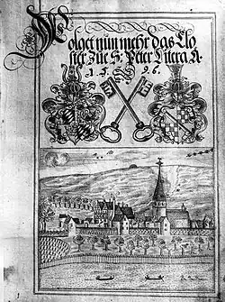 - ↑ Vgl. (auch zum Folgenden) Michael Kuen: S. Petri. In: ders.: Collectio Scriptorum Rerum Historico-Monastico-Ecclesiasticarum Variorum Religiosorum Ordinum, Bd. V/1. Wagegg / Wohler, Günzburg / Ulm 1765.