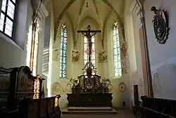 Der zweijochige, gotische Chor mit einem Fünfachtelschluss hat ein Kreuzrippengewölbe mit drei figuralen Schlusssteinen und hohe zwei- und dreiteilige Maßwerkfenster, außen zweimal abgetreppte Strebepfeiler. Das vierjochige Langhaus wurde im 3. Viertel des 18. Jahrhunderts umgebaut und mit einem Platzlgewölbe auf Wandpfeilern überwölbt, die flache Altarnischen bilden. Bei diesem Umbau wurden auch im Chor Pilaster angebracht. Zugleich wurde nordseitig eine dreiteilige, stuckierte und von einem Mittelturm überragte Eingangsfront errichtet, die den Kirchplatz dominiert.