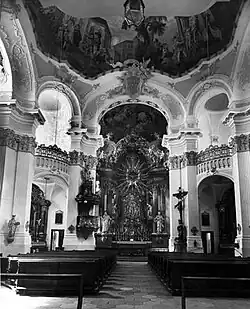Der im Jahr 1736 begonnene Kirchenbau ersetzte die einstige Schutterkapelle. Die dort verehrte Marienstatue, die sogenannte Schuttermutter, war eine spätgotische Marienstatue aus dem Beginn des 15. Jahrhunderts und erfreute sich so großer Beliebtheit, dass ein größerer Bau erforderlich wurde. Das Hauptmotiv des Baus war ein Zentralraum auf dem Grundriss eines ungleichschenkligen Oktogons mit einer weit vorgezogenen Ädikula mit einer Eingangsnische. Der Bau Fischers zeigte auch das Motiv der Eckabschrägung mit gegeneinander versetzten korinthischen Säulen mit kurvierten Gebälkstücken. Die Deckenfresken waren ein Werk von Johann Baptist Zimmermann.
