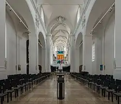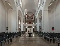 Seitdem wurde die Kirche mehrfach renoviert und umgestaltet, wobei die barocke Ausrichtung der Kirche beibehalten wurde. Erst die jüngste Neugestaltung (September 2010 bis November 2011), die stets kontrovers diskutiert wird, wich hiervon ab, indem sie das Communio-Modell als raumbestimmendes Konzept umsetzte.[6] Die theologische Idee hinter der Umgestaltung ist das Verständnis von Kirche als „Nachfolgegemeinschaft von Gleichgestellten“, das in Gal 3,28 formuliert wird: „Bei euch gilt kein Unterschied zwischen Juden und Griechen, Freien und Sklaven, Mann und Frau.“ Diese Idee findet ihre Umsetzung unter anderem in folgenden Punkten: