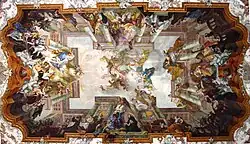 Der Chor ist sowohl an den Wänden als auch an der Decke, das Langhaus nur an der Decke durch Fresken von Johann Anwander gestaltet. Die Fresken zeigen größtenteils Begebenheiten aus dem Leben des Heiligen Augustinus. Die restlichen Fresken beziehen sich auf andere Ordensheilige. Neben der Orgel befindet sich das Storrsche Oratorium. Es ist eine kastenförmige Loge. An der Ostseite der Loge prangt ein prächtiges Wappen der Storr von Ostrach.
