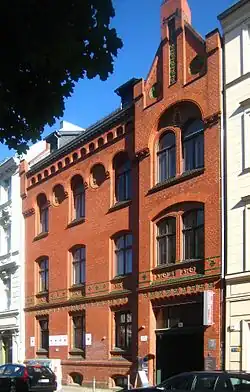 - Im Schulgebäude, Auguststraße 21, war zunächst die 10. städtische Realschule, später, in den 1940er Jahren, eine Berufsschule untergebracht. Zu DDR-Zeit wurden die Gebäude zunächst von der 11. Polytechnische Oberschule und seit den 1970er Jahren von einer Oberschule für Sehschwache genutzt. 1999 zog das kommunale Kulturhaus Mitte ein, das zuvor in der Rosenthaler Straße 51 seinen Sitz hatte.[8][9] Im Jahr 2011 zog ein Teil einer Grundschule hier ein, die als Grundschule am Koppenplatz Berlin, Standort Auguststraße geführt wird. Die Ostfassade des Seitenflügels ist in Backstein ausgeführt und zeigt einen restaurierten Mosaikfries unterhalb der Traufe (vom Gelände des St. Hedwig-Krankenhauses zu sehen). Im Vorderhaus, direkt an der Auguststraße haben sich die Galerie Weißer Elefant, ein Refugium und das Kinderatelier Farbklang eingemietet (Stand Mai 2016).