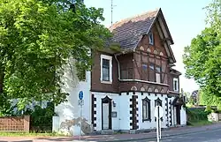 Das auch als Gasthaus Rosengarten bekannte zweigeschossige Gebäude wurde in der Zeit um 1890 in massiver Bauweise aus Ziegeln errichtet. Am oberen Stockwerk ist ein Zierfachwerk in historisierenden Formen eingearbeitet. Zur Straße hin besteht ein das Erscheinungsbild des Hauses prägender Risalit mit drei Achsen. Das Satteldach des Risaliten kragt weit vor. An der südlichen Seite des Hauses befindet sich unmittelbar an der Straße ein Rundturm.