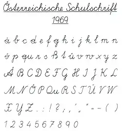 1995 wurde eine neue Version der „Österreichischen Schulschrift“ verabschiedet. Dabei wurden die Schleifen im Inneren der Buchstaben a, d, g, o und bei vielen Großbuchstaben entfernt. Das P und R wird nicht mehr in einem Zug geschrieben, das X ähnelt dem Antiqua-X und die Ziffern sind schnörkelloser. Seit dem Schuljahr 1995/96 haben die Lehrer freie Wahl: Es kann beim Schreiblehrgang wahlweise die neue „Österreichische Schulschrift 1995“ oder die ältere „Österreichische Schulschrift 1969“ als Ausgangsschrift verwendet werden.[24] Ab dem Schuljahr 2023/24 soll die Schulschrift 1969 nicht mehr gelehrt werden.[25]
