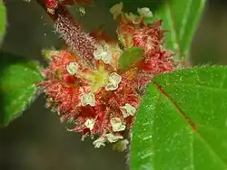 In einzeln in den Blattachseln sitzenden, kompakten, zymösen Blütenständen sind wenige bis viele Blüten zusammengefasst. Die anfangs 1,5 bis 3 Millimeter langen, lanzettlich-eiförmigen bis elliptischen, stumpfen Tragblätter sind am Grund etwas verwachsen und vergrößern sich bis zur Fruchtreife. Die meist zwittrigen, grünlichen Blüten besitzen einen Durchmesser von 2 bis 3,5 Millimetern. Die Kelchblätter sind etwa 3 mm lang und nach innen gekrümmt.[2][3]