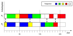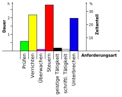 Die Zeitanteile und die Zeitpunkte der Tätigkeiten können mit Hilfe von Zeitstudien oder Multimomentstudien ermittelt werden. Ein Diagramm zur Tätigkeitsverteilung kann Zusammenhänge aufzeigen und Hinweise auf zusammenlegbare Arbeitsplätze liefern. Beispielhaft ist ein Diagramm in Bild dargestellt.