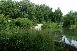 Der Kanal trennt einen schmalen Landstreifen vom übrigen Gebiet der Wolfzahnau ab, der quasi dadurch eine Insel bildet. Früher führte eine Fußgängerbrücke auf diese Insel, die jedoch inzwischen nur noch als Stahlskelett über dem Auslaufkanal besteht und nicht betreten werden kann.