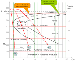 Beim Abschrecken von Austenit auf Raumtemperatur bei geringen Kohlenstoffgehalten kann sich das Gefüge vollständig in Martensit umwandeln. Es erfolgt ein diffusionsloser Umklappvorgang, bei dem 2-kfz-Elementarzellen eine tetragonal-verzerrte Elementarzelle bilden. Der Kohlenstoff hat nicht die Zeit, zu diffundieren, bleibt zwangsgelöst und verändert dadurch die Gitterstruktur.[5] Bei höheren Kohlenstoffgehalten und bestimmten Legierungselementen (siehe unten) bleibt ein mit dem Kohlenstoffgehalt zunehmender Anteil Austenit als Restaustenit neben Martensit erhalten. Martensit-Start- und Martensit-Finish-Temperatur haben sich erniedrigt. Bei langsamer Abkühlung aus dem Austenit-Gebiet, unterhalb von 723 °C, kommt es zur Ausscheidung von Perlit, einem lamellenartig strukturierten Gemisch aus Ferrit und Zementit.[6] Die Verwendung von Zeit-Temperatur-Umwandlungsschaubildern (ZTU-Diagrammen) ermöglicht es, für eine bestimmte Legierungszusammensetzung in Abhängigkeit von Abkühltemperatur und Abkühlgeschwindigkeit zu bestimmen, welche Phase am Ende einer Wärmebehandlung entsteht.