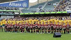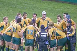 1928 kamen die Verbände überein „dass die australischen Sportfarben grün und gold Verwendung finden sollen“. Beim Besuch der All Blacks im darauf folgenden Jahr spielten die Wallabies in einem smaragdgrünen Trikot mit dem aufgestickten australischen Wappen und grünen Socken. In den 1930er Jahren blieb das Trikot fast unverändert.[113] Als die Wallabies 1933 erstmals Südafrika besuchten, trugen die Gäste zur Vermeidung von Verwechslungen himmelblaue Trikots, da damals beide Mannschaften in dunkelgrünen Trikots spielten. Während der Australientour 1953 trugen die Südafrikaner weiße Trikots und während ihrer Tour 1961 trugen die Wallabies goldfarbene Trikots.[114]