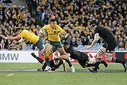 Die erste Begegnung zwischen Australien und den All Blacks aus Neuseeland fand am 15. August 1903 in Sydney statt und ging mit 3:22 verloren.[18] Die Tour der All Blacks führte vorübergehend zu einem Popularitätsschub für den Rugbysport, als deutlich mehr Zuschauer die Spiele in Sydney und Brisbane besuchten.[19] Ein Jahr später waren die British Lions erneut zu Besuch und die Australier verloren alle drei Test Matches.[20] Die Gründung der New South Wales Football League (NSWFL) im Jahr 1903 führte zu einer Schwächung des Rugbysports in New South Wales, da mehrere führende Privatschulen einige Jahre lang nur noch Australian-Football-Spiele anstatt Rugbyspiele veranstalteten. Kurze Zeit schien es sogar, als ob sich Australian Football auch in der Gunst des Publikums durchsetzen würde.[21] Schwer getroffen wurde der reine Amateursport Rugby Union in seiner Hochburg durch die Einführung von Rugby League im Jahr 1905. Zahlreiche Vereine im Raum Sydney wechselten zur professionell betriebenen Variante und gründeten einen eigenen Verband, der vor allem katholische Schulen zu einem Wechsel zum League-Code überzeugen konnte. Diese Schulen gelten bis heute als Stützpfeiler der League-Dominanz im Großraum Sydney. Prominente Nationalspieler wie Dally Messenger wechselten ebenfalls und verhalfen der Konkurrenz zum Durchbruch.[22] Im selben Jahr fand die erste Tour nach Neuseeland statt.