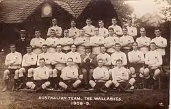 1908/09 unternahm die Nationalmannschaft ihre erste mehrmonatige Tour nach Großbritannien und Nordamerika. Bei den Olympischen Spielen 1908 in London, die während der Tour stattfanden, gewannen die Wallabies die Goldmedaille mit einem 32:3-Sieg im einzigen Spiel des Turniers gegen die Grafschaftsauswahl von Cornwall. Das erste Test Match gegen Wales ging mit 6:9 verloren, hingegen konnten die Wallabies England mit 9:3 bezwingen und somit ihren ersten Auswärtssieg feiern. Als die Mannschaft nach Hause zurückkehrte, wechselten elf mitgereiste Spieler zu League-Vereinen.[23]