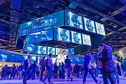 Die LED-Installation in der Eingangshalle, die polySTAGE, wird bei Veranstaltungen als Registratur, Ausstellung und Bühne genutzt. Arrangiert in 2 Ringen, besteht sie aus 52 Einzel-Paneelen und drei fix verbauten LED-Flächen. Die Einzel-Paneele werden über Motoren gesteuert und lassen sich bis zum Boden herabfahren.