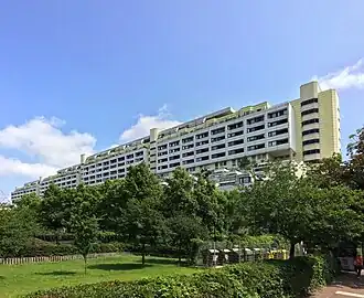 Das Hauptgebäude, die eigentliche Autobahnüberbauung Schlangenbader Straße, erreicht die Gesamtlänge von 600 Metern und eine maximale Höhe von 46 Metern. Es hat in den mittleren Riegeln eine maximale Geschossanzahl von 14. Dieses Gebäude beinhaltet 1064 Wohneinheiten und zählt damit zu den größten zusammenhängenden durchgängig begehbaren Wohnkomplexen Europas. In der angrenzenden Randbebauung sind weitere 694 Wohneinheiten untergebracht, was eine Gesamtanzahl von 1758 Wohneinheiten auf dem Areal ergibt. Es wurden 120 verschiedene Grundrissvarianten realisiert.