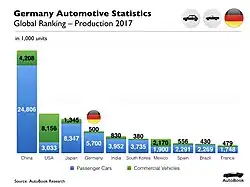 Derzeit dominieren fünf deutsche Unternehmen und sieben Marken die Automobilindustrie im Land: Volkswagen AG (und Tochtergesellschaften Audi und Porsche), BMW AG, Daimler AG, Adam Opel AG und Ford-Werke GmbH. Im Jahr 2014 wurden in Deutschland fast sechs Millionen Fahrzeuge produziert, im Jahr 2020 waren es jedoch nur noch 3,7 Millionen, und etwa 5,5 Millionen werden von deutschen Marken im Ausland produziert.[6] Deutschland gehört neben den USA, China und Japan zu den Top 4 Automobilherstellern der Welt. Der Volkswagen-Konzern ist einer der drei größten Automobilkonzerne der Welt (neben Toyota und General Motors).