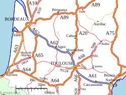 Die Autoroute A61/A62 (Autoroute des Deux-Mers) ist eine der wenigen französischen Autobahnen, die nicht sternförmig von Paris ausgehen, sondern als Transversale das Mittelmeer bei Sète und den Atlantik bei Bordeaux am nordöstlichen Fuß der Pyrenäen verbindet.
