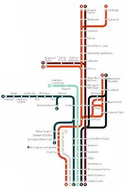 Avanti West Coast bietet Fernverkehrsverbindungen zwischen dem Bahnhof London Euston und Zielen im Nordwesten Großbritanniens an. Pro Stunde verlassen etwa acht Züge den Kopfbahnhof Euston und folgen mehrheitlich der West Coast Main Line über Milton Keynes Central und Rugby, wo etwa ein Viertel zum Bahnhof Birmingham New Street abzweigt. Die übrigen Verbindungen führen weiter nach Manchester Piccadilly oder über Crewe nach Liverpool Lime Street, Chester oder kleineren Städten.