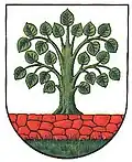 Auf silbernem Wappenschild steht auf braunem Fels und grünem Schildfuß eine grüne Linde.