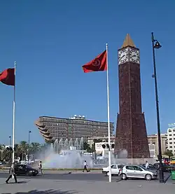 Der Uhrenturm, dahinter das brutalistische Hôtel du Lac am Kreisverkehr Place d’Afrique