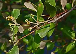 Die Blüten stehen in rispenähnlichen Blütenständen, sind radiärsymmetrisch, gelb-orangefarben, wohlriechend und haben Durchmesser von bis zu sechs Millimeter. Die Blütenkrone ist vierlappig und weitgehend unbehaart mit Ausnahme kleiner Drüsenhaare. Die Staubblätter sind kurz, maximal zwei Millimeter lang und ragen nicht aus der Blüte heraus. Die Staubfäden sind etwa gleich lang wie die Staubgefäße. Der Fruchtknoten wird zwei bis drei Millimeter lang mit einem kurzen, glatten Griffel.[3] Die Bestäubung erfolgt durch Bienen.[8]