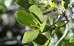 Die Blätter stehen kreuzgegenständig. Die Blattstiele werden bis zu drei Zentimeter lang, sind gelblich behaart und gefurcht. Die ledrige Blattspreite ist eiförmig und an der Blattspitze abgerundet. Die Adern sind unauffällig, die Mittelrippe steht an der Blattunterseite hervor. Die Oberseite ist glatt, die Unterseite mit zahlreichen kleinen Härchen bedeckt, welche die leicht gräulich bis olivgrüne Farbe verursachen.[3][6] Zur Regulation des Salzhaushalts sind sowohl an den Ober- als auch Unterseiten der Blätter Salzdrüsen, die eine salzhaltige Flüssigkeit ausscheiden. Trocknet die Flüssigkeit, bilden sich auf den Blättern Salzkristalle.[7]