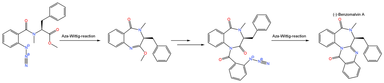 Ein Beispiel der Anwendung der aza-Wittig-Reaktion war die Synthese von (−)-Benzomalvin A. Zwei intramolekulare aza-Wittig-Reaktionen wurden in diesem Beispiel angewendet, um den Siebenring und den Sechsring zu konstruieren.[1]