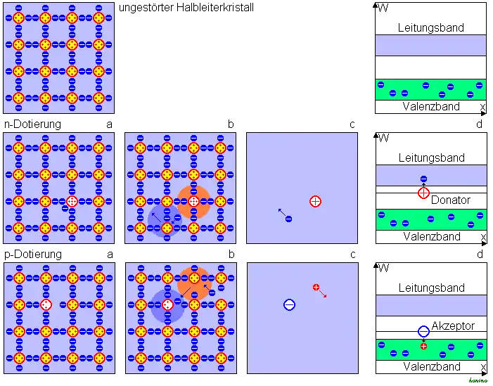 Durch Dotierung kann ein Halbleiter gezielt mit Ladungsträgern ausgestattet werden. Der Halbleiterkristall beruht auf einem Kristallgitter aus 4-wertigen Atomen, die jeweils durch vier Elektronenpaare gebunden sind. Dotierung mit 5-wertigen Atomen hinterlässt im Gitter ein für die Bindung nicht erforderliches Elektron, das somit nur locker gebunden ist (Abbildung unten, Bild a). Mit nur geringer Energie kann es daher ins Leitungsband angehoben werden und ist hier beweglich (Bild b). Ein solches Atom nennt man einen Elektronen-Donator (lateinisch donare ‚geben‘). Der Kristall wird mit beweglichen negativen Ladungsträgern ausgestattet, man spricht von einer n-Dotierung. Zugleich bleibt ein positiver Atomrumpf im Gitter zurück. Lässt man den Hintergrund der neutralen Grundsubstanz außer Betracht (Bild c), so hat man eine positive feste und eine negative bewegliche Ladung ins Gitter eingebracht. Energetisch liegt ein Donator knapp unterhalb des Leitungsbandes, da wegen der schwachen Bindung des „zusätzlichen“ Elektrons wenig Energie zur Anregung ins Leitungsband vonnöten ist (Bild d).