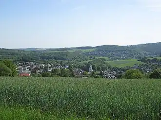 ![]() Bärstadt im Taunus von Westen, dahinter Wambach. Rechts im Hintergrund der Große Feldberg