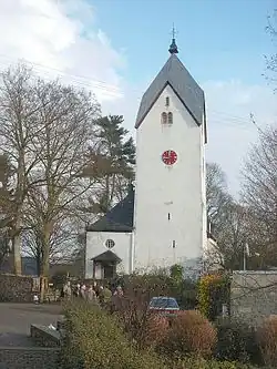 Im Turm und in den Grundmauern gibt es romanische Bauteile. Außerdem wurden bei Ausschachtungsarbeiten Bodenplatten eines Vorgängerbaus gefunden, die um 1250 hergestellt wurden. 1996 wurden sie in der Nähe des Taufsteins in den heutigen Boden eingesetzt. Die älteste Glocke wurde zwischen 1200 und 1250 gegossen. Die beiden jüngeren Glocken wurden im Jahr 1468 von dem Glockengießer Paulus zu Uedersdorf zu Andernach gegossen. Der Kirchenbau, wie er heute steht, stammt erst aus den Jahren 1709–1717. Er steht in einem kleinen Park, der bis ins 18. Jahrhundert Kirchhof war, woran noch einige alte Grabsteine erinnern. Tatsächlich wurden bei Bauarbeiten in der angrenzenden Hauptstraße Reste einer alten Klostermauer gefunden.