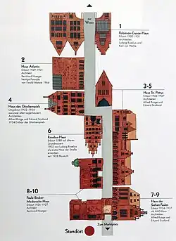 - Robinson-Crusoe-Haus: Das Gebäude wurde 1931 als das letzte Haus der Straße errichtet und von Karl Weihe sowie Ludwig Roselius entworfen. Die Figur Robinson Crusoe wählte Roselius aus, da sie exemplarisch für den hanseatischen Tatendrang und Pioniergeist steht. Bis zur Zerstörung des Hauses 1944 dienten die Räumlichkeiten dem Club zu Bremen für seine Treffen. Seit dem Wiederaufbau im Jahr 1954 erinnern im Treppenhaus kolorierte Tafeln in der Art von Holzschnitt-Druckplatten von Theodor Schultz-Walbaum geschnitzt, an Episoden des namengebenden Romans.