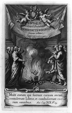 Auf den Titelkupfern des Index Librorum Prohibitorum wurde der Anspruch der päpstlichen Zensurbehörde auf Kontrolle des gesamten Wissens symbolisch dargestellt, als im 18. Jahrhundert Ketzerverbrennungen längst obsolet geworden waren: Die Ausgabe von 1711 zeigt, wie der Heilige Geist als ein Bannstrahl das Feuer entfacht, in dem die verbotenen Bücher brennen. Aber seit der Amtszeit Benedikts XIV. (1758) wurde programmatisch die Szene von Apg 19,19 auf den Titel gesetzt (Foto). Da die Besitzer ihre Bücher hier selbst ins Feuer werfen, ist dies (nach Hubert Wolf) gegenüber früher ein aufgeklärteres Menschenbild der Römischen Inquisition, die darauf setzte, dass Argumente die Irrenden von der katholischen Wahrheit überzeugen könnten. Diese Ikonographie blieb auf den Ausgaben des Index bis ins 19. Jahrhundert in Kraft, danach verzichtete man ganz auf ein Titelbild.[12]
