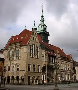 1985 begann die Sanierung der alten Lateinschule an der Schulstraße, in die anschließend die Stadtbücherei einzog.[47] Dies war das erste Projekt der Stadtsanierung, eines umfangreichen Förderprogramms, bis zu dessen Ende im Jahr 2004 etliche städtebauliche Maßnahmen verwirklicht wurden. Zu den ersten gehörten der Umbau des ehemaligen Windt-Anwesens zur Begegnungsstätte, die Umgestaltung des Sablé-Platzes sowie die Renovierungen von Münchhausen-Burgmannshof (Hubschraubermuseum), ehemaliger Hof-Apotheke und Landesmuseum, ebenfalls ein ehemaliger Burgmannshof. Am westlichen Rand des Stadtzentrums wurde Ende der 1980er-Jahre das Gewerbegebiet Schmiedeweg ausgewiesen, in dem sich 1988 als erstes Unternehmen eine Fabrik für Fleisch- und Wurstwaren der Edeka-Gruppe niederließ.