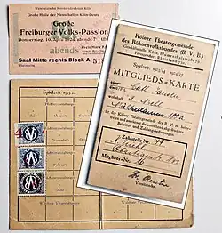 Die Ortsausschüsse oder Landesverbände vereinbarten mit den regionalen Theatern die Abnahme bestimmter Kartenkontingente, die von den Mitgliedern zu vergünstigten Preisen in den Geschäftsstellen erworben werden konnten (um die 50 % Rabatt). In der Anfangszeit zahlten Personenmitglieder einen Jahresbeitrag (für eine Spielzeit) von 10 Reichsmark, erhielten dafür Eintrittsvergünstigungen sowie kostenlose Theaterberatung und Zeitschriften des BVB.[10] Die Jahresbeiträge konnten auch monatlich gezahlt werden. Die Kölner Theatergemeinde des Bühnenvolksbundes versah ihre Mitgliedsausweise mit Beitritts- und Zahlungsbedingungen – diese führten aus:
