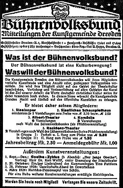 Der Bühnenvolksbund (BVB) war parallel zur Volksbühnen-Bewegung die zweite große Theaterbesucher-Organisation in der Zeit der Weimarer Republik. Der BVB bestand von 1919 bis 1933 und hatte in seiner Blütezeit 17 Landesverbände und 235 Ortsgruppen mit rund 220.000 organisierten Mitgliedern.[1] Der Bühnenvolksbund trug den Namenzusatz Vereinigung zur Theaterpflege im christlich-deutschen Volksgeist und verfolgte ein dramaturgisches und theaterpolitisches Programm mit konservativer Ausrichtung. Ebenso wie die politisch links stehende Volksbühnenbewegung wurde der Bühnenvolksbund im Zuge der NS-Machtergreifung gleichgeschaltet. Eine bürgerliche Traditionslinie setzte sich nach dem Zweiten Weltkrieg fort in dem 1951 gegründeten Bund der Theatergemeinden.