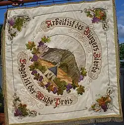 Die Rückseite der alten Vereinsfahne mit dem Ortssymbol, der Alten Kapelle, Weinreben sowie dem Spruch „Arbeit ist des Bürgers Zierde – Segen ist der Mühe Preis“