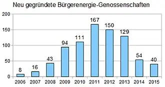 Die Anzahl der Bürgerenergiegenossenschaften nahm insbesondere ab 2008 rasant zu.[8] Von 2008 bis 2011 hat sich die Anzahl von Energiegenossenschaften mit erneuerbaren Energien vervierfacht. Mehr als 150 Energiegenossenschaften wurden allein im Jahr 2011 gegründet. Schon im selben Jahr engagierten sich über 80.000 Bürger in genossenschaftlichen Bürgerkraftwerken und investierten ca. 800 Millionen Euro in die Energiewende. Zumeist handelte es sich um gemeinsame Solaranlagen, an denen bereits kleine Beteiligungen möglich sind. Der Deutsche Genossenschafts- und Raiffeisenverband würdigte Energiegenossenschaften deshalb als Treiber der Energiewende, da sie Bürgern einen günstigen Rahmen schaffen, sich vor Ort für den Umbau der Energieversorgung zu engagieren und die Akzeptanz für Energieprojekte in der Region steigern.[9]
