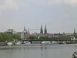 Brücke von Osten zwischen Museum Weserburg und Schlachte mit Kirche St. Stephani