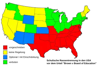 Während der 1940er und 1950er Jahre gewann die NAACP mit Thurgood Marshall mehrere Verfahren, in denen er nachweisen konnte, dass die Bildungseinrichtungen seiner schwarzen Mandanten im Vergleich zu denen der Weißen nicht gleichwertig waren. Anfang der 1950er Jahre plante die NAACP jedoch, sich nicht mehr auf die Doktrin „getrennt, aber gleichwertig“ zu berufen, sondern sie anzugreifen. Nach einem mehrjährigen Prozess fällte der Oberste Gerichtshof 1954 ein historisches Urteil im Fall Brown v. Board of Education, das die Rassentrennung an Schulen als in sich nicht gleichwertig und somit für generell verfassungswidrig erklärte und ihre Aufhebung anordnete. Es gab zwar keinen festgelegten Zeitraum für die Umsetzung des Urteils, das im Übrigen keine anderen öffentlichen Einrichtungen als nur Schulen betraf. Doch das Urteil löste unter den Schwarzen Amerikas Begeisterung aus, während es unter Weißen – insbesondere im Süden – auf Widerstand stieß.