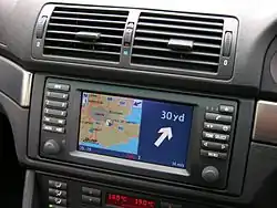 Auf Wunsch waren auch ein D-Netz-Autotelefon, eine Handy-Vorbereitung und ein satellitengestütztes Navigationssystem mit Bordmonitor und (nur bei Fahrzeugstillstand nutzbarer) TV-Funktion lieferbar. Die Zielführung des Navigationssystems lässt sich sowohl per Routenkarte in verschiedenen Maßstäben als auch per Richtungspfeil darstellen.[12] Später wurde das Navigationssystem um eine dynamische Zielführung (TMC) ergänzt.[21] Für das Autotelefon und das Navigationssystem war ab Herbst 1998 optional eine Sprachsteuerung verfügbar. Mittels Spracheingabe können Rufnummern oder Namen gewählt oder bestimmte Funktionen des Navigationssystems abgerufen werden, ohne die Hände vom Lenkrad zu nehmen. Anfangs nur in deutscher Sprache angeboten, standen ab Frühjahr 1999 weitere europäische Sprachen zur Auswahl.[18] In Verbindung mit Telefon und Navigationssystem war ab Frühjahr 1999 der Telematikdienst BMW Assist erhältlich.[31] Bei einem Unfall, bei dem mindestens ein Airbag ausgelöst worden ist, setzt BMW Assist automatisch einen Notruf ab und übermittelt den Standort des Fahrzeugs.[32]