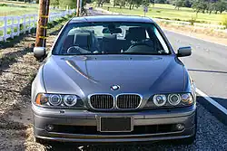 Im Herbst 2000 erhielt der 5er ein Facelift. Die vorderen Doppelscheinwerfer wurden ersetzt und waren nun von Standlichtringen mit Lichtleitertechnik umfasst. Hinter dem gemeinsamen Scheinwerfer-Deckglas saßen nun runde Blinkleuchten. Auch das Schlusslicht der Rückleuchten wurden auf Lichtleitertechnik umgerüstet: Vier rote Leuchtdioden pro Seite speisen vier horizontal angeordnete Leuchtstäbe. Die bisherigen eckigen Nebelscheinwerfer wurden durch runde ersetzt und gehörten nun bei allen Modellen zur Serienausstattung. Die Frontschürze wurde neu gestaltet, die Stoßleisten wurden in Wagenfarbe lackiert (außer bei Fahrzeugen mit M Aerodynamikpaket) und die BMW-Nieren erhielten breitere Chromeinfassungen.[14]