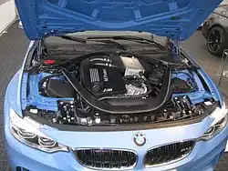 Angetrieben wird der M3 (F80), der auf dem BMW F30 basiert, von einem Biturbo-Reihensechszylinder mit 3,0 Liter Hubraum mit Ladeluftkühler.[8] Der BMW S55 ist vom BMW N55 abgeleitet, leistet 317 kW (431 PS) und bietet zwischen 1850 und 5500 min−1 ein maximales Drehmoment von 550 Nm. Die Beschleunigung von 0 auf 100 km/h beträgt je nach Getriebe 4,1 bis 4,3 s. Zur Wahl stehen ein manuell zu schaltendes Sechsganggetriebe und ein 7-Gang-Doppelkupplungsgetriebe;[2] letzteres bewirkt trotz 40 Kilogramm mehr Gewicht die schnellere Beschleunigung.