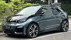 Der BMW i3 ist ein rein elektrisch betriebenes Fahrzeug. Sein Motor leistet maximal 125 kW und kann ein Drehmoment von 250 Nm abgeben.[47] Er war auf Wunsch mit Verbrennungsmotor (Ottomotor) als Reichweitenverlängerer erhältlich, wobei letzterer nach einer Modellpflege mit Vergrößerung der Batteriekapazität seit Oktober 2018 in Europa nicht mehr angeboten wurde.[48]